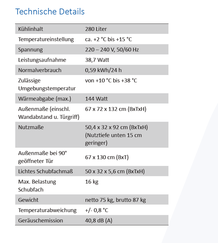 - Umluftkühlung, schaltet beim Öffnen der Tür automatisch ab, sorgt für gleichmäßige Temperierung und reduziert das Temperaturgefälle auf ein Minimum.